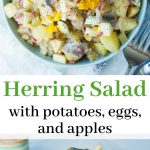 This herring salad is so simple and delicious! It’s made with only a couple of ingredients and it’s super easy to make! It’s very hard to stop eating this Polish / German herring salad – it´s so good. Pickled herring, potatoes, apples, and onions is a classic flavor combination. Additionally, I added hard-boiled eggs, cucumbers in brine and quick-pickled onions for crunch and a pop of color. All these ingredients go extremely well together.