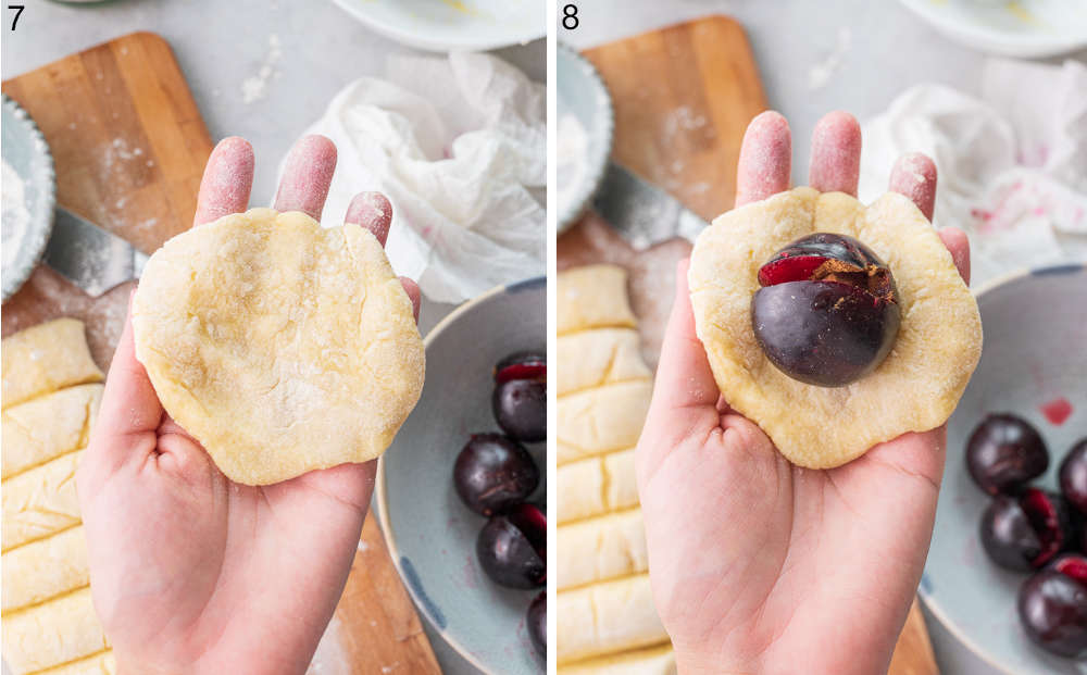 - Flour your hands. Take one part of the dough and flatten it into a disk. Place one plum in the middle. Wrap the dough around the plum. Pinch the seam well so it won’t open while cooking. Roll between your palms so you have a ball of dough.