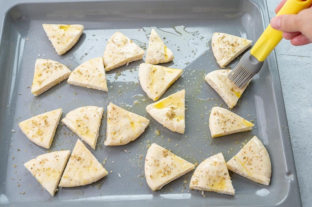 - Cut each pita bread into 6 triangles (see photos in the post for a reference).