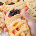 These pizza mummies are such an easy and delicious savory Halloween treat. Spooky pizza hand pies that look like mummies. The kids will go crazy on this fun snack!