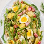 Amazing potato and asparagus salad with eggs, smoked fish, sauteed radishes, and honey-mustard sauce. It’s light but also very filling. This no-mayo potato salad is a great side dish or you can eat it as a light summer/spring dinner.