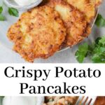 Potato pancakes are thin potato cakes make with raw grated potatoes, eggs, and sometimes onions. They are shallow-fried in a pan until crispy on the edges and soft in the middle. They are served with a wide array of toppings and very popular in many European countries.