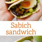 Sabich sandwich is a delicious Israeli fast food. My recipe is made with pita bread filled with pan-fried eggplant, hard-boiled eggs, tomato and cucumber salad, and green tahini sauce. It’s delicious and packed with flavor. It’s a really good idea for a meatless dinner or snack, even for meat-eaters.