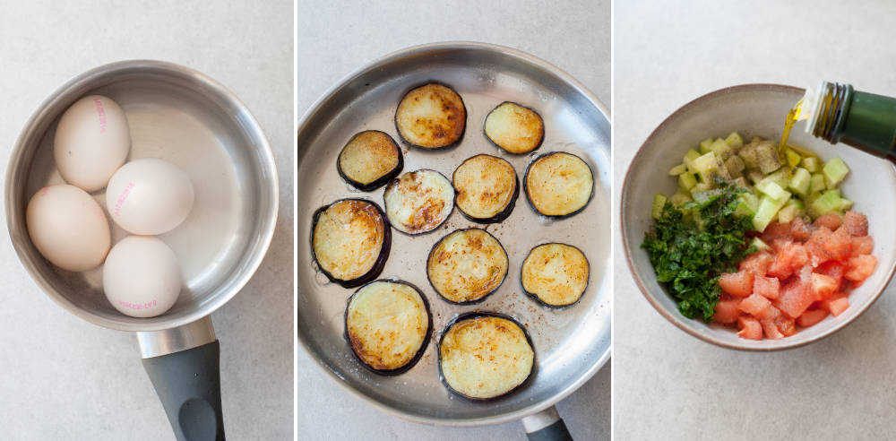 STEP 4: Pan-fry the eggplant: Cut 1 small eggplant into 1/2-inch (1 cm) slices. Heat 1/4 cup of frying oil in a big frying pan and cook the eggplant in batches until it’s browned on both sides and soft. Try not to overcrowd the eggplant slices in the pan, letting the eggplant brown nicely. Transfer to a plate lined with paper towels and season immediately with salt and pepper to taste (while the eggplant is still hot).