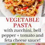 A delicious and quick vegetarian pasta full of vegetables. Crispy zucchini and bell pepper in tomato and feta cheese sauce. Seasoned with lots of garlic and herbs. Feta cheese adds a punch of flavor! It’s one of our go-to quick weeknight dinners.